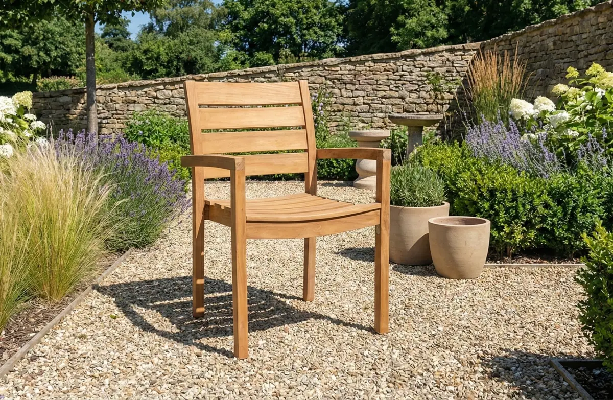 | Eigenschaften | Hochwertiges indonesisches Teakholz, stapelbar und platzsparend, langlebig, komfortable Sitzfläche |