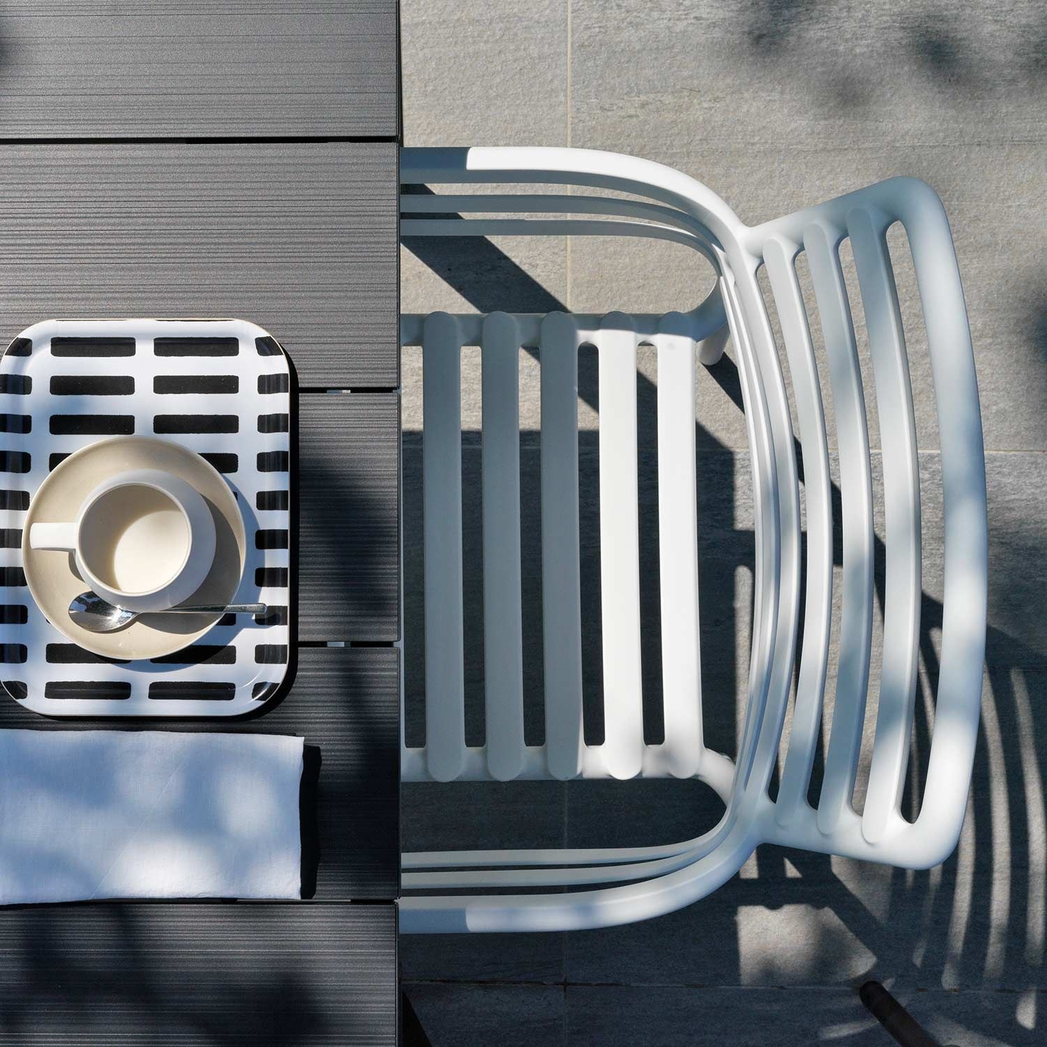 Der stapelbare Gartenstuhl Nardi Doga ist aus hochwertigem Glasfaserharz gefertigt und verkörpert Langlebigkeit und Komfort. Dank dieser Konstruktion ist der Stuhl wartungsfrei, einfach zu reinigen, leicht und recycelbar. Eine UV-beständige Beschichtung bewahrt die Farbintegrität, während das moderne, minimalistische Design, entworfen von Raffaello Galiotto, mit seinen horizontalen Lamellen einen zeitgenössischen Akzent setzt.