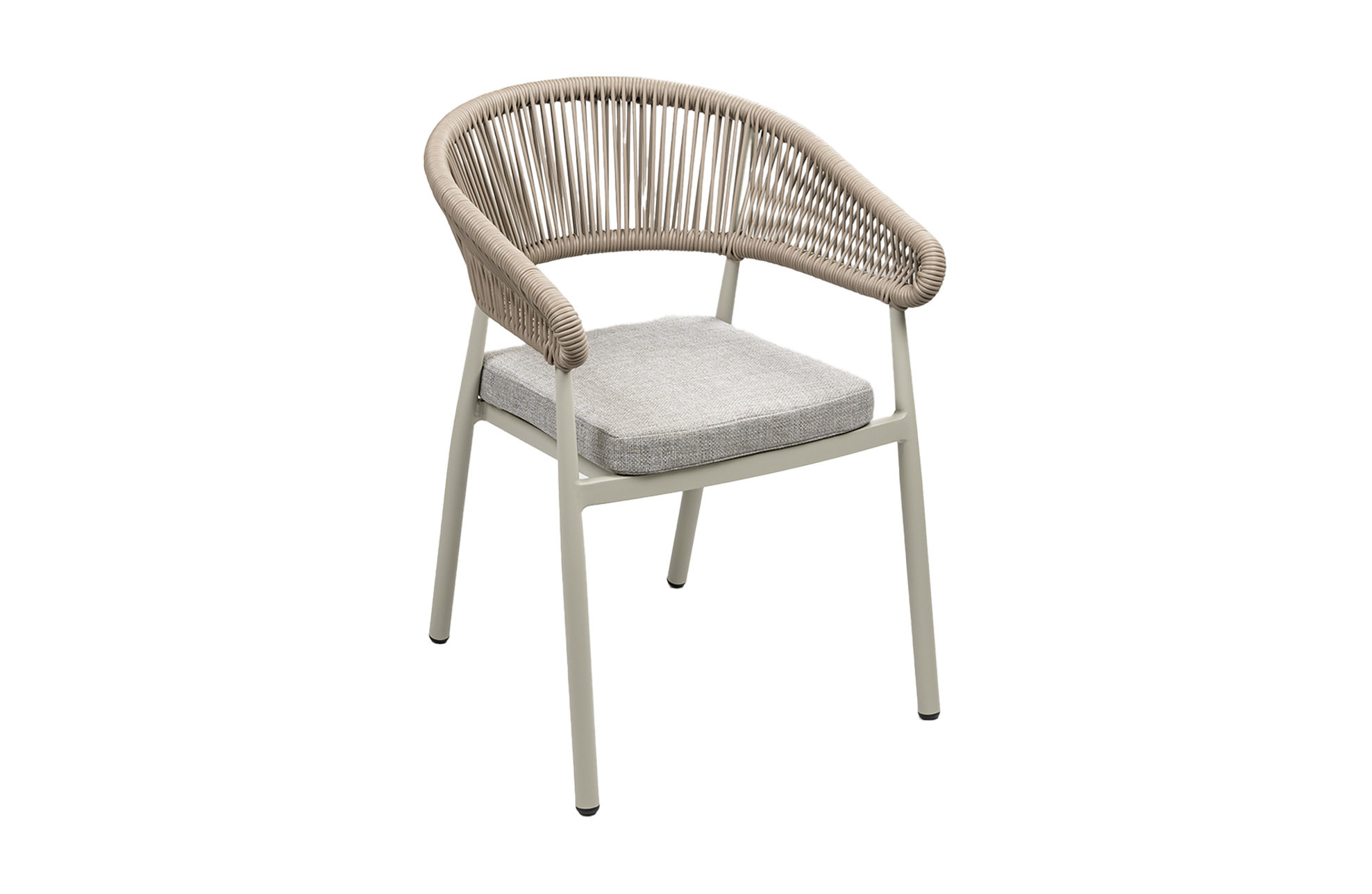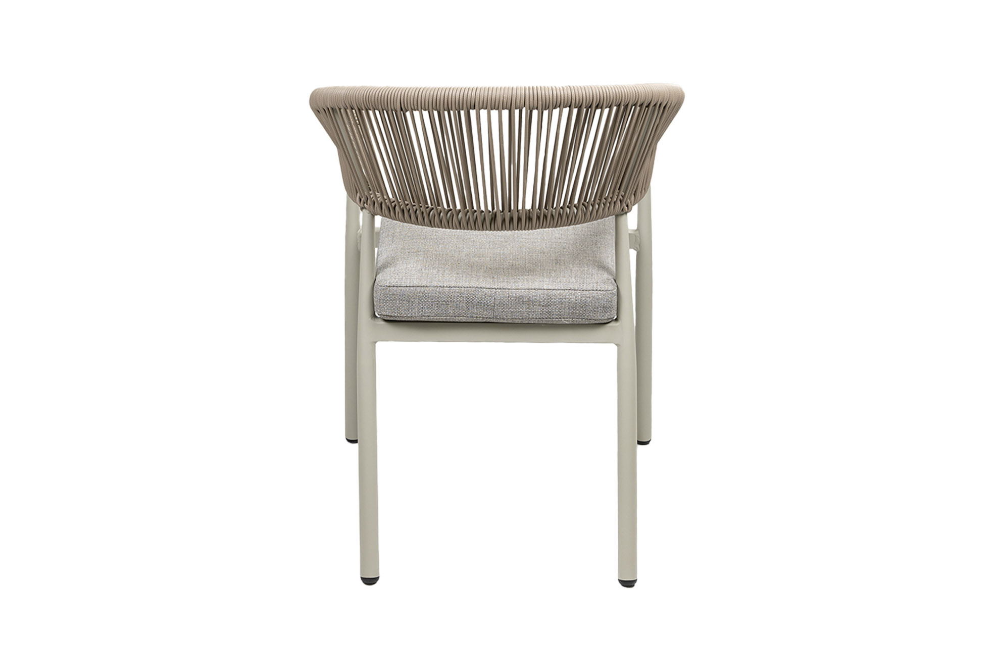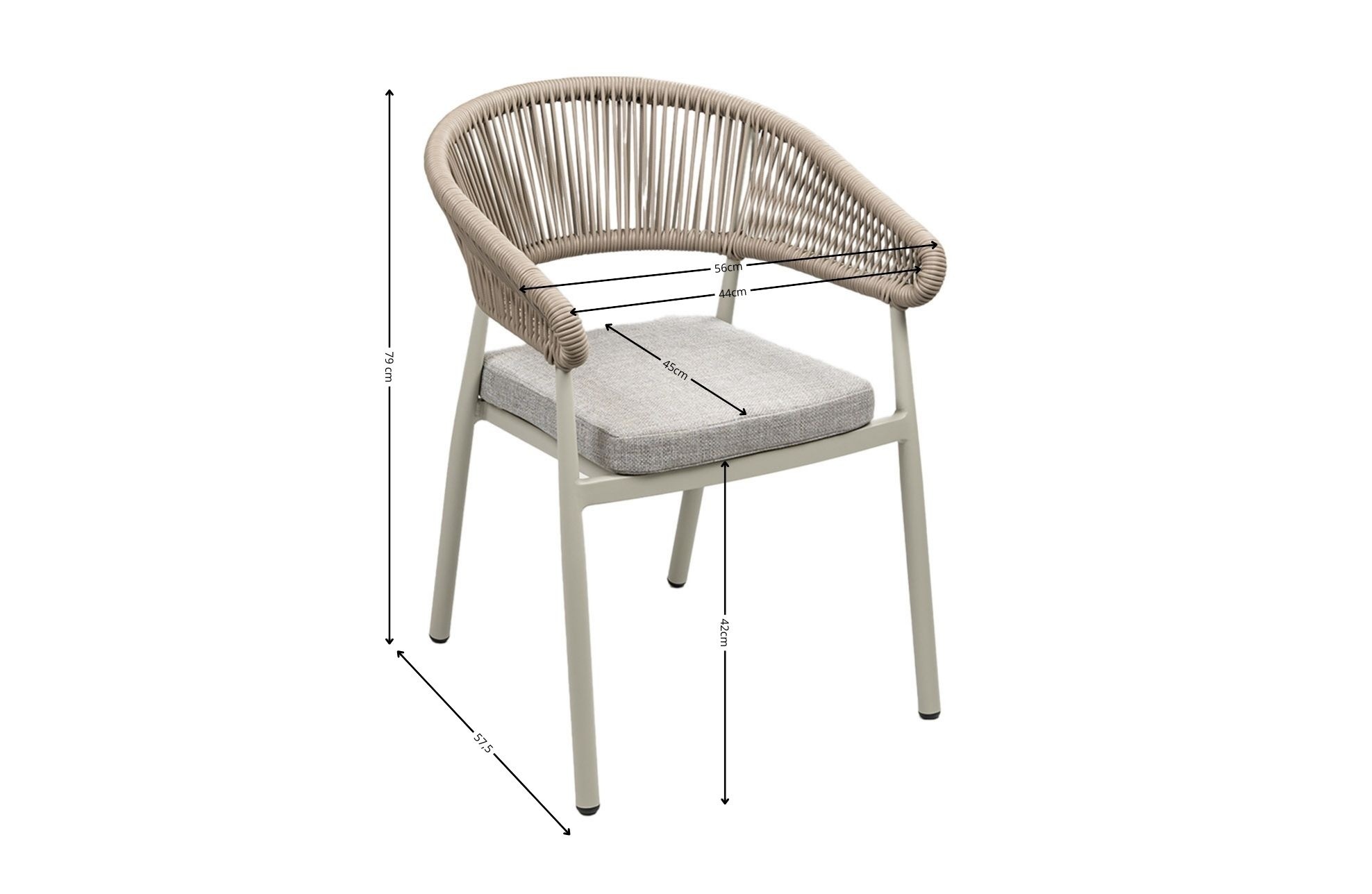 Sind Sie auf der Suche nach einem stilvollen Gartenstuhl aus Seil? Dann ist der Esszimmerstuhl Knokke genau das Richtige für Sie! Dieser modern gestaltete Stuhl ist mit einem sehr flexiblen, starken und witterungsbeständigen Seil bespannt. Durch die Flexibilität des Seils stützt er den Rücken gut und nimmt die natürliche Form des Rückens an. Dieser geflochtene Gartenstuhl lässt sich sehr gut mit einem stilvollen Teakholztisch oder einem modernen Tecon Teak Gartentisch kombinieren. Das Gestell besteht aus pulverbeschichtetem Aluminium in der eleganten Farbe Sand, die Ihrer Terrasse sofort eine warme Ausstrahlung verleiht. Dieser sandfarbene Gartenstuhl hat ein feines Sitzkissen in der Farbe Camel.