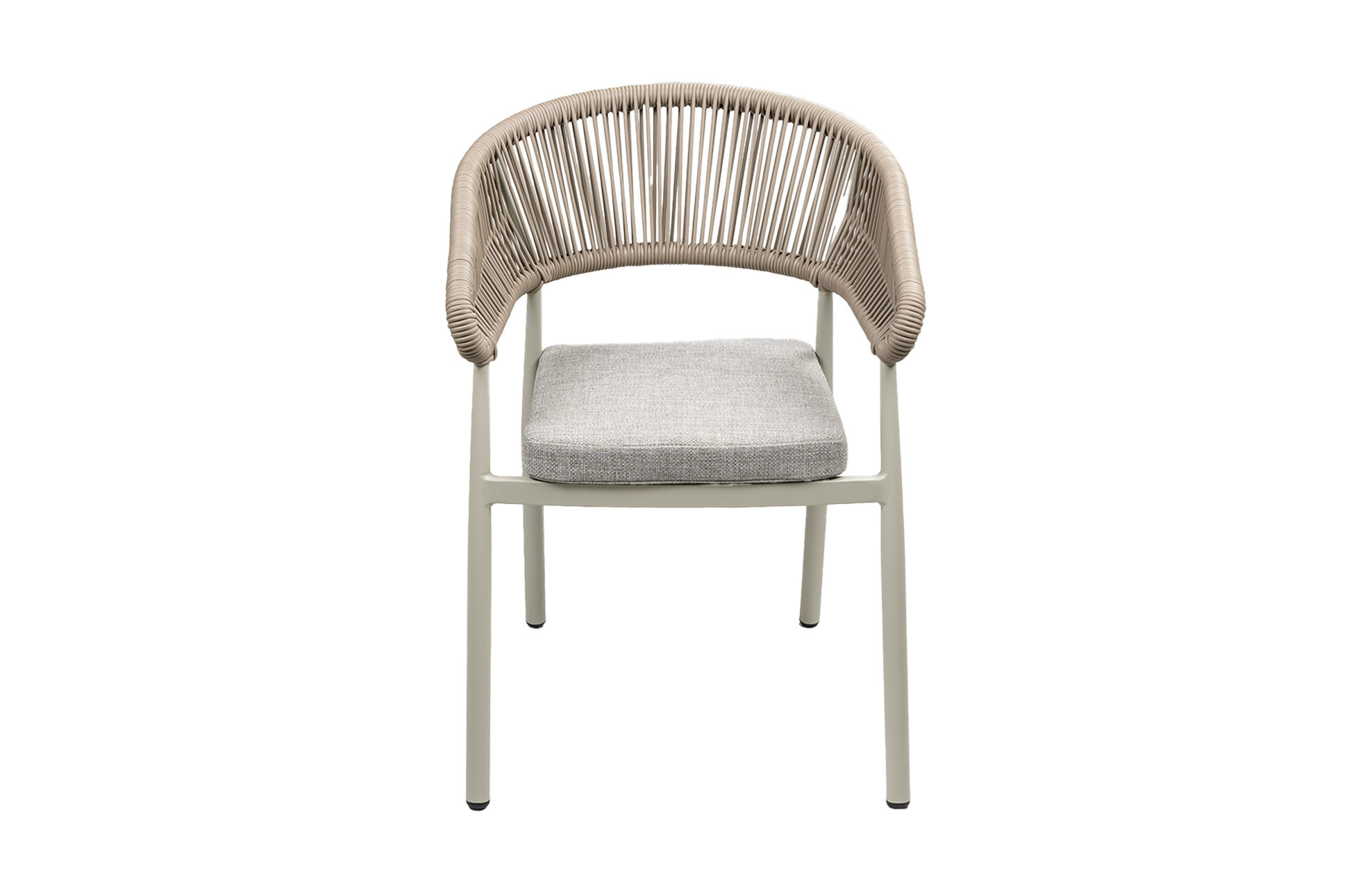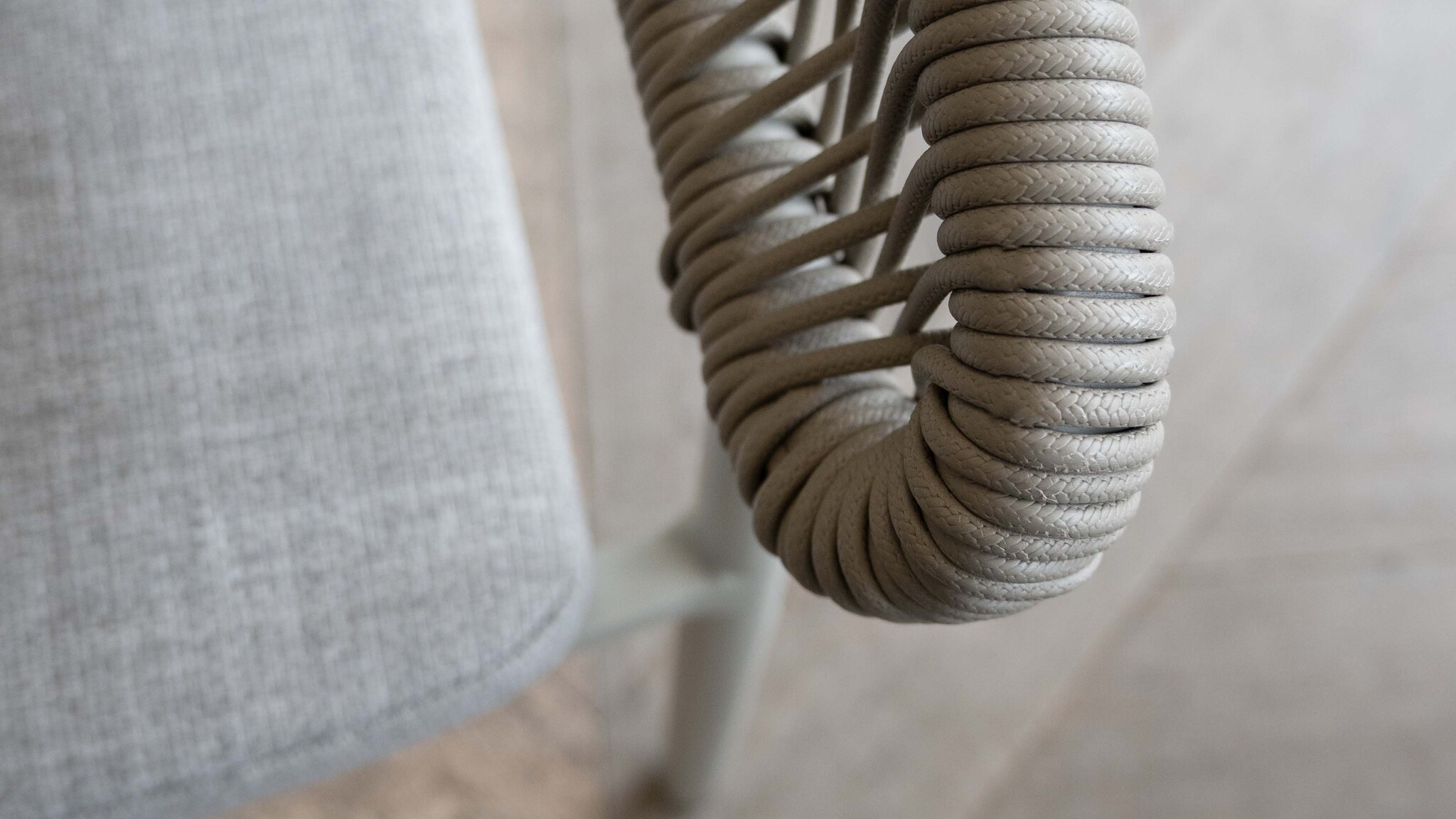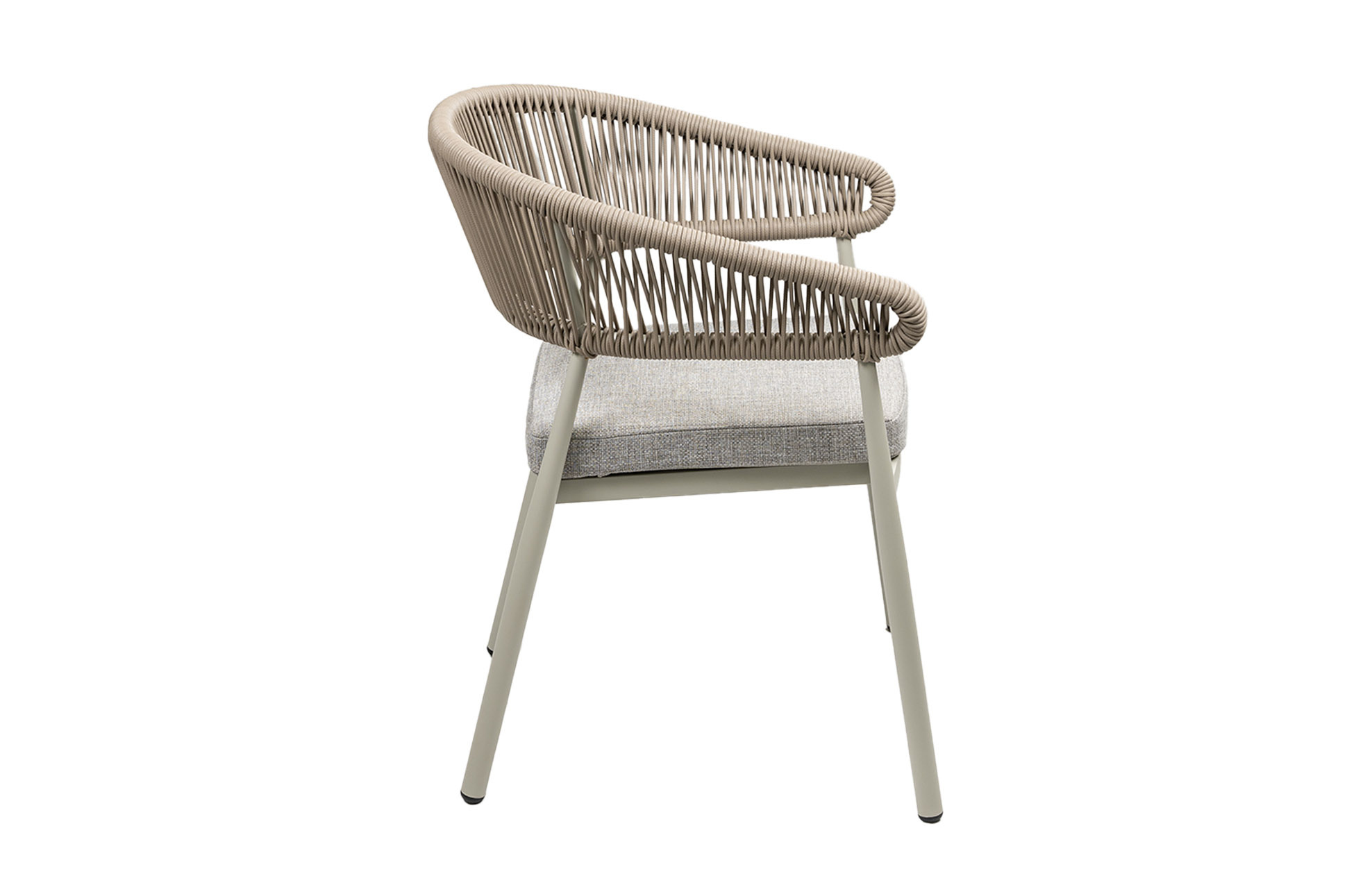 Sind Sie auf der Suche nach einem stilvollen Gartenstuhl aus Seil? Dann ist der Esszimmerstuhl Knokke genau das Richtige für Sie! Dieser modern gestaltete Stuhl ist mit einem sehr flexiblen, starken und witterungsbeständigen Seil bespannt. Durch die Flexibilität des Seils stützt er den Rücken gut und nimmt die natürliche Form des Rückens an. Dieser geflochtene Gartenstuhl lässt sich sehr gut mit einem stilvollen Teakholztisch oder einem modernen Tecon Teak Gartentisch kombinieren. Das Gestell besteht aus pulverbeschichtetem Aluminium in der eleganten Farbe Sand, die Ihrer Terrasse sofort eine warme Ausstrahlung verleiht. Dieser sandfarbene Gartenstuhl hat ein feines Sitzkissen in der Farbe Camel.