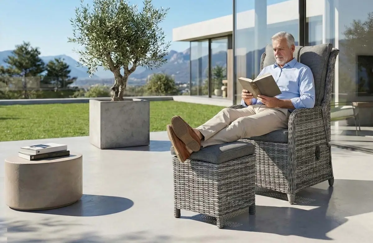 | Eigenschaften | UV-beständig, wetterbeständig, pflegeleicht, halbrundes Wicker, stabiles Sicherheitsglas |
